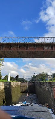 Noch eine Bemerkung zum letzten Foto: Wie bereits früher in diesem Blog beschrieben, ist der Canal de Centre in Chagny unterbrochen. Nachdem während 3 Monaten gar nichts gelaufen ist, wird aktuell beim Pont de Bouzeron versucht eine Sperre einzubauen, um später die gestrandeten Boote in Richtung Fragne zu evakuieren. Die erste Variante der Sperre - BigBags mit Sand gefüllt - war zu wenig dicht. Mittlerweile wurde die Stelle mit Humus abgedichtet. Das Wasser lässt man aus Richtung St. Legier s. Dheune einlaufen. Mit Pumpen wird es dann über die Sperre befördert. Wie uns die selber Betroffenen Isabelle und Raymond berichten, klappt das Auffüllen nicht immer wie geplant. Zu kleine Pumpen, defekte Pumpen, defekte Schläuche ect. ect. In drei / vier Tagen sei der Wasserspiegel immerhin um 30cm angestiegen. Was dem Schreibenden noch nicht so ganz klar ist... woher wird das Wasser kommen, um die Schleusen hinunter zur Saône zu füllen. Soweit ich das Wassermanagement auf dem Canal de Centre verstanden habe, kommt der grösste Teil des Wassers aus den grossen Speicherseen auf der Scheitelhöhe und fliesst damit von Schleuse zu Schleuse in Richtung Saône.