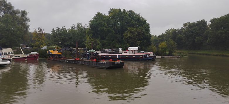 Im Moment sind die Angestellten der VNF dabei, mit einem Bagger die Wasserpflanzen auszureissen. Der Schreibende kann sich allerdings nicht erklären, weshalb gerade in dieser Ecke des Hafens die Arbeiten ausgeführt wurden. Es gäbe Orte, an denen wesentlich mehr Wasserpflanzen die Navigation behindern.